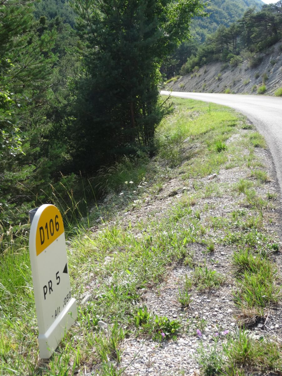 From Valdrôme the D106 is clearly marked, and apart from one pair of hairpins (by one of the interesting bits of geology en route) it's a fairly direct 400m ascent. You might get a little confused by the altitudes given on the km markers: I suspect that some of the later ones have been inflated by 100m, as you pass two over 1100m (the second at 1170m), then carry on climbing to the col at 1115m. Curious.